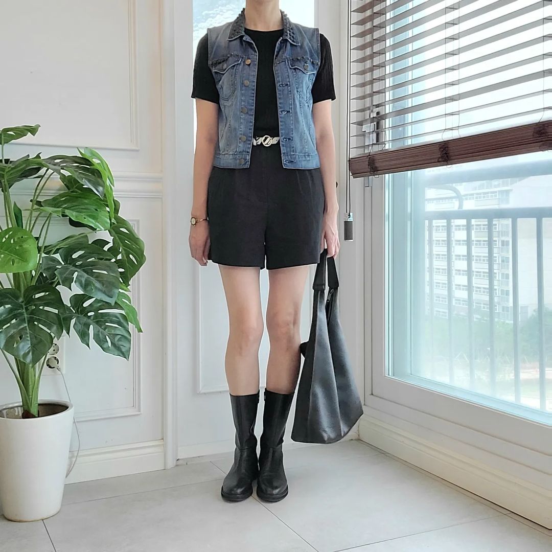 올블랙코디 allblackoutfit 미니멀시크 데님베스트 zarastyle 버뮤다팬츠 빅백 린넨반바지 린넨팬츠 미들부츠 꾸안꾸패션