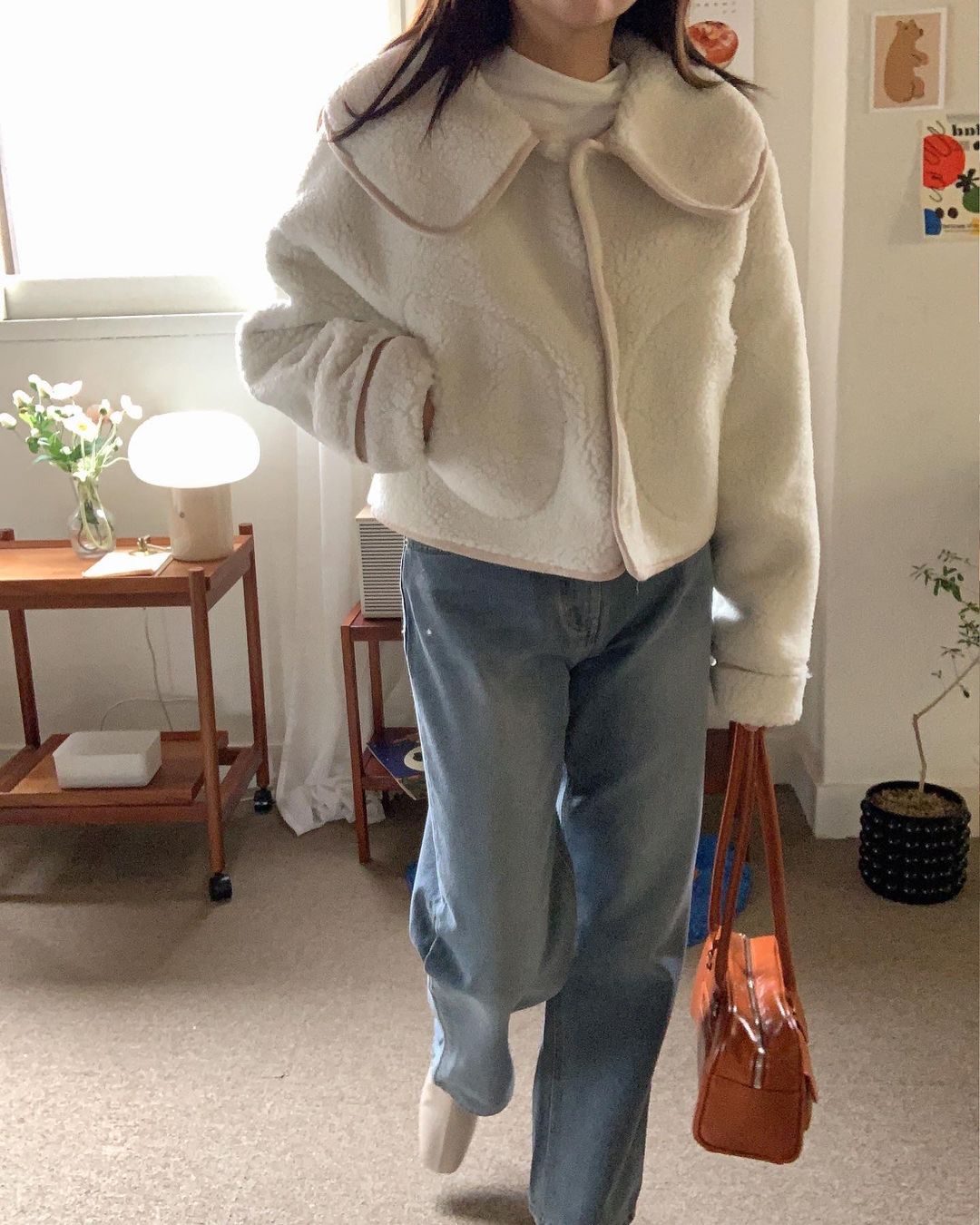 숏한 기장감이 넘 귀여븐 카라무스탕🤎 이너로 입은 셔링기모티도 페미닌한 무드에 편하게 입기 좋아서 매장에서 반응 ◡̈ ෆ 아참 데님도 예쁘니깐 봐주세요,,,👖🤍