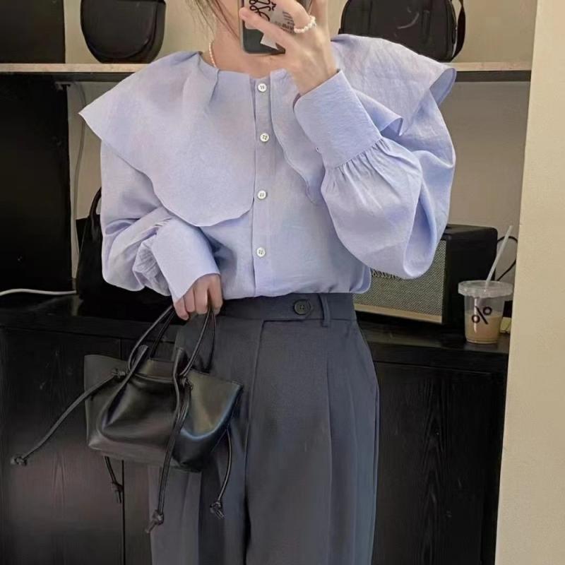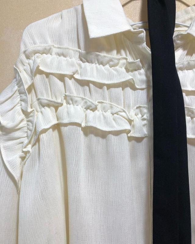 러블리한 무드의 러플 블라우스에요! 쉬폰 소재로 격식 있는 자리나 데이트에 추천드립니다.